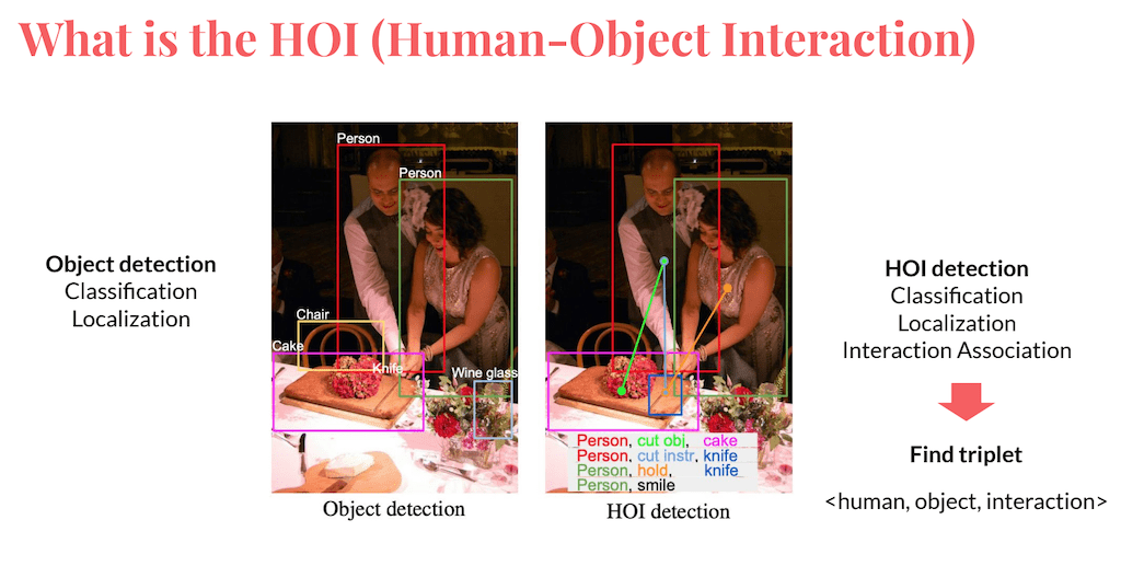 먼저 HOI에 대해서 설명드리겠습니다. HOI detection은 기존 Object detection과는 다르게 사람과 물체 간의 상호 작용을 탐지합니다. 왼쪽에 Object detection은 단순히 물체 또는 사람을 찾고 그 종류를 분류하는 반면, 오른쪽에 HOI detection에서는 물체와 사람을 Localize 하고 classification 한 후 그들 간의 상호 작용 즉, Interaction Association을 찾는 과정이 추가되어 있습니다. 최종적으로 HOI detection의 목표는 사람, 물체, 상호작용 이 세 가지의 쌍인 Triplet을 찾는 것을 목표로 합니다. human, object, Interaction 테스크는 하나의 이미지에서 인간, 물체, 상호작용을 예측하는 task로 단순 Object detection보다 이미지 신에 대한 더 높은 수준의 이해를 요구한다고 볼 수 있습니다.
