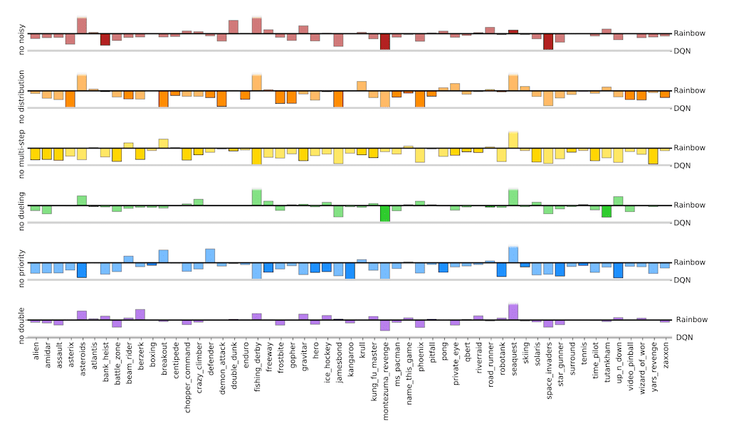 어떤 특정 요소가 빠졌을 때 특정한 게임에서 어느 정도의 퍼포먼스를 갖는지를 비교한 그래프입니다. 마찬가지로 전반적으로는 모든 요소가 다 들어가 있을 때 가장 퍼포먼스가 나은 것을 확인할 수 있습니다.