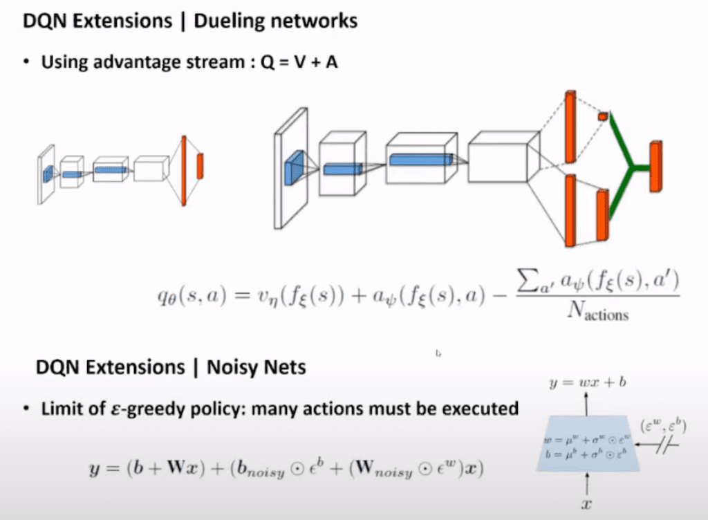 Noisy Nets은 E-greedy policy에 따라서 다음 스텝에 대한 At을 정하게 됩니다. 그때 E-greedy policy에 의해서 탐험될 수 있는 limitation을 네트워크 구조에다가 linear 계산이 들어가는 부분에다가 Noise를 더해서 조금 더 나은 학습을 할 수 있게 도입을 한 개념입니다.