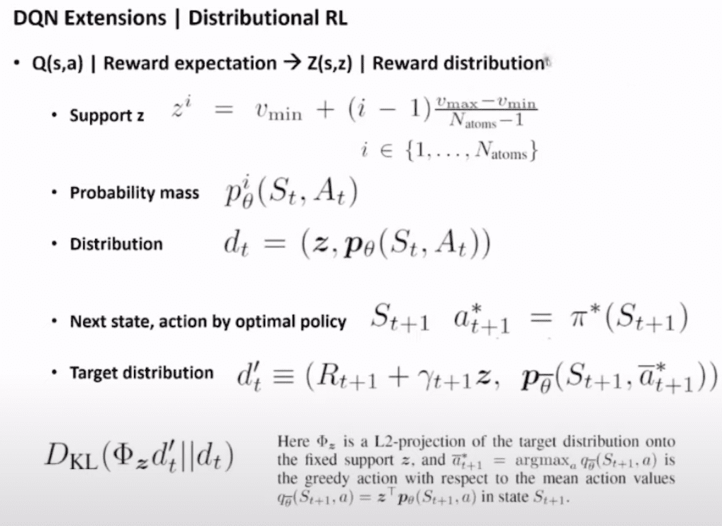그래서 Reward Distribution을 정의를 하는 개념들이 필요합니다. 첫 번째로는 support vector z가 필요합니다. support vector z는 가질 수 있는 Rt 공간을 미니멈 값과 맥시멈 값, 몇 개의 vector 요소를 사용할 것인지에 대한 세 개의 hyperparameter로 구성되어 있는 공간입니다. 공간이 주어져있을 때 St와 At이 주어지면 특정한 support element에 대해서 probability mass를 정의를 할 수가 있습니다. Distribution은 probability mass의 구성으로 이루어져 있고 이 개념을 바탕으로 해서 현재 상태에서 다음 스텝으로 넘어갈 때 어떤 optimal policy가 있다고 한다면 이 optimal policy에 대한 optimize를 진행해야 되기 때문에 Target Distribution에 대한 구성을 Q값이 아닌 Rt의 Distribution으로 구성을 할 수 있다는 개념입니다. Target Distribution을 optimize 하기 위해서는 DKL를 사용하는데, 그 공간에 대한 projection이 필요하게 됩니다.