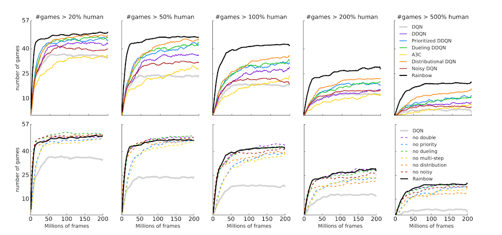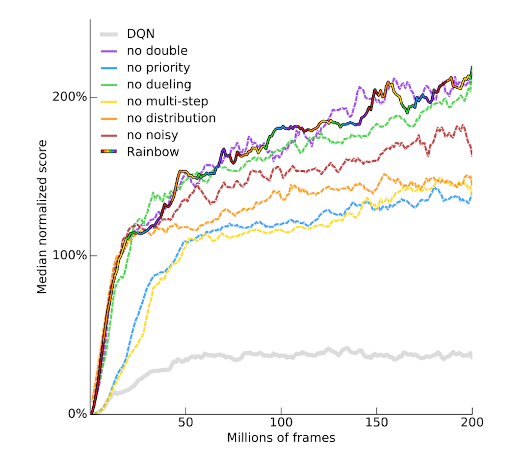 결과입니다. integration 된 Agent를 활용을 해서 기존에 발표됐던 결과들과 비교를 진행하였습니다. integration 된 Rainbow라는 Agent가 앞서 발표됐던 모든 Agent들을 능가하는 것을 확인할 수 있습니다. 이는 학습의 효율면에서도 굉장히 빠르게 학습을 하는 것을 확인을 할 수 있었고, 그리고 모든 다른 네트워크들 중에서 가장 높은 값을 월등히 능가하는 퍼포먼스를 보이는 것을 확인할 수 있습니다.