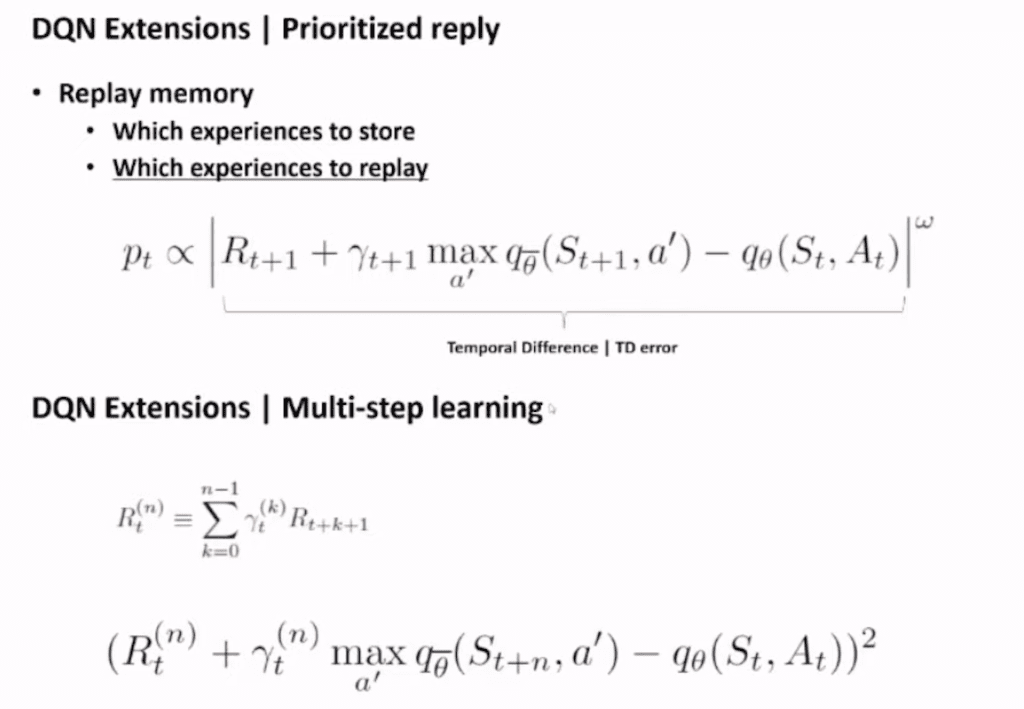 그리고 Multi-step learning은 기존 DQN에서는 다음 현재 주어진 St에서 바로 다음 스텝에 대한 Rt만을 가지고 학습했습니다. 여기에서 n 스텝 이후에 얻을 수 있는 Rt를 가지고도 학습을 진행할 수 있다는 개념입니다.