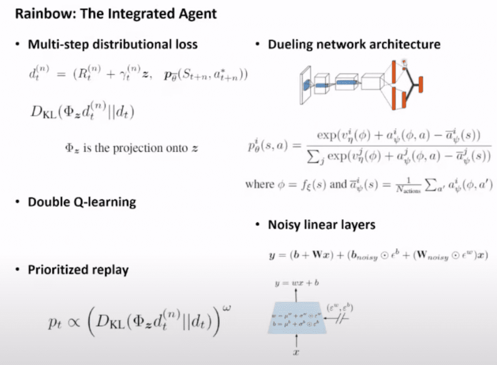 위에서 설명한 EXTENSION들을 모두 다 기존의 Deep Q learning의 프레임에다가 추가를 하였습니다. 그래서 네트워크가 inference을 하는 것이 Q값이 아니고 Distribution이 되고 다음에 Multi step learning으로 가기 때문에 Multi step Distributional loss를 사용을 합니다.