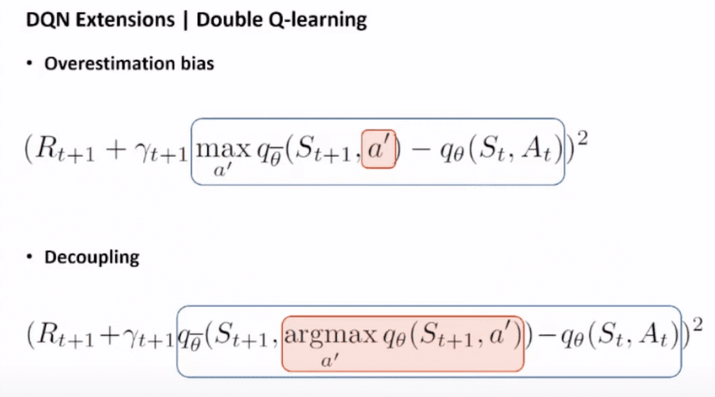 다음에 발표된 여러 EXTENSION들이 있는데, 논문에서 사용한 EXTENSION들은 여섯 가지가 있습니다. 먼저 Double Q learning의 개념입니다. Double Q learning의 개념은 훈련 과정에서 다음 At에 대한 추론을 할 때 Target network에서 다음 At를 추론합니다. Target network에서 At을 추론을 할 때 At이 가장 큰 Rt를 가지게끔 하는 과정에서 Rt가 overestimation 될 수 있습니다. 그래서 그것을 극복하기 위해서 At을 추론하니까 다음 스텝의 사용할 At을 뽑아내는 부분하고 Rt의 계산을 하는 네트워크를 분리해서 overestimation 되는 bias를 줄이고자 했습니다.