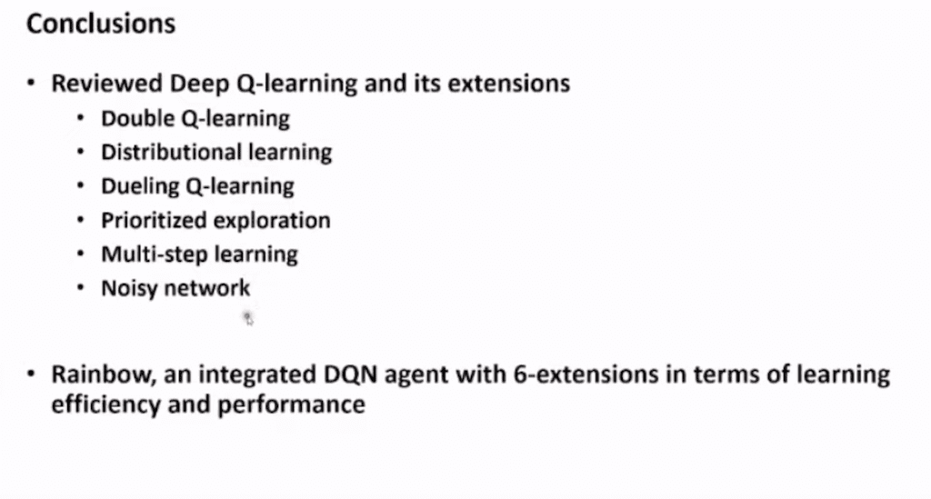 결론입니다. Deep Q learning과 여러 EXTENSION들에 대해서 리뷰를 진행했습니다. 그 결과 integration 된 Agent가 학습효율과 퍼포먼스에서 모두 다 월등히 다른 모델들을 능가했다고 결론을 지을 수 있습니다.
