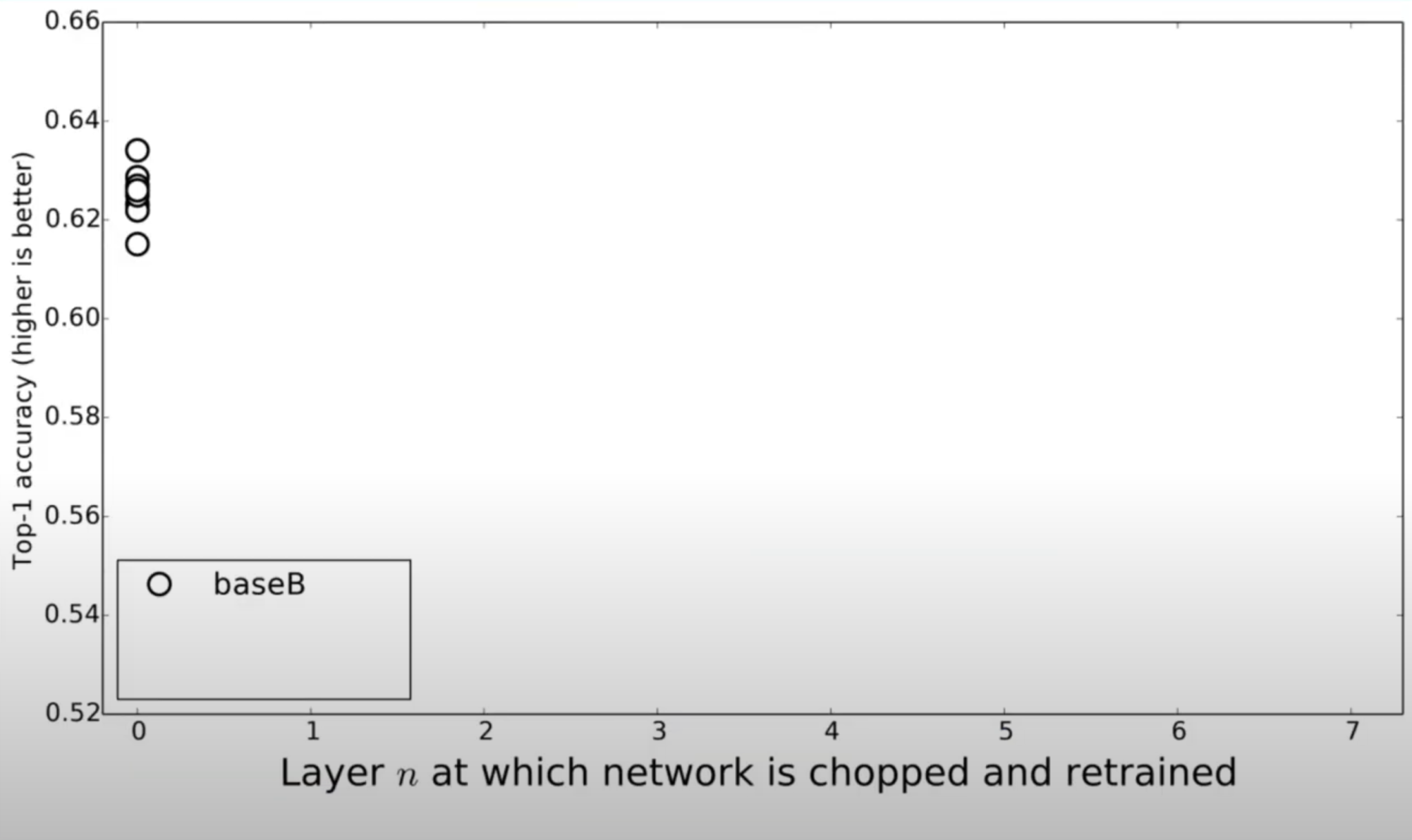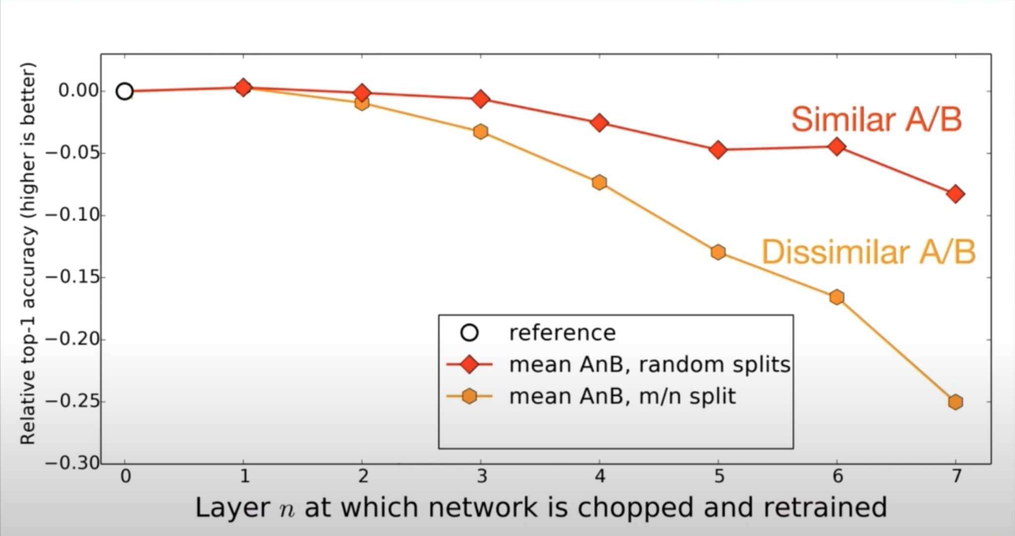 위 그림에서, 각 점들은 케이스들에 대해서 여러 번 학습을 하고, accuracy를 표시한 것이고, 전체적으로 봤을 때 AnB는 n이 커짐에 따라서 accuracy가 줄어드는 것을 알 수 있습니다. 여기서 알 수 있는 것은 transfer lerning을 했지만 n이 커질수록, 그리고 layer가 freeze 되었기 때문에 그리고 점점 후반부 layer로 갈수록 task A에 specific 하기 때문에 accuracy가 떨어진다는 것을 볼 수 있습니다.