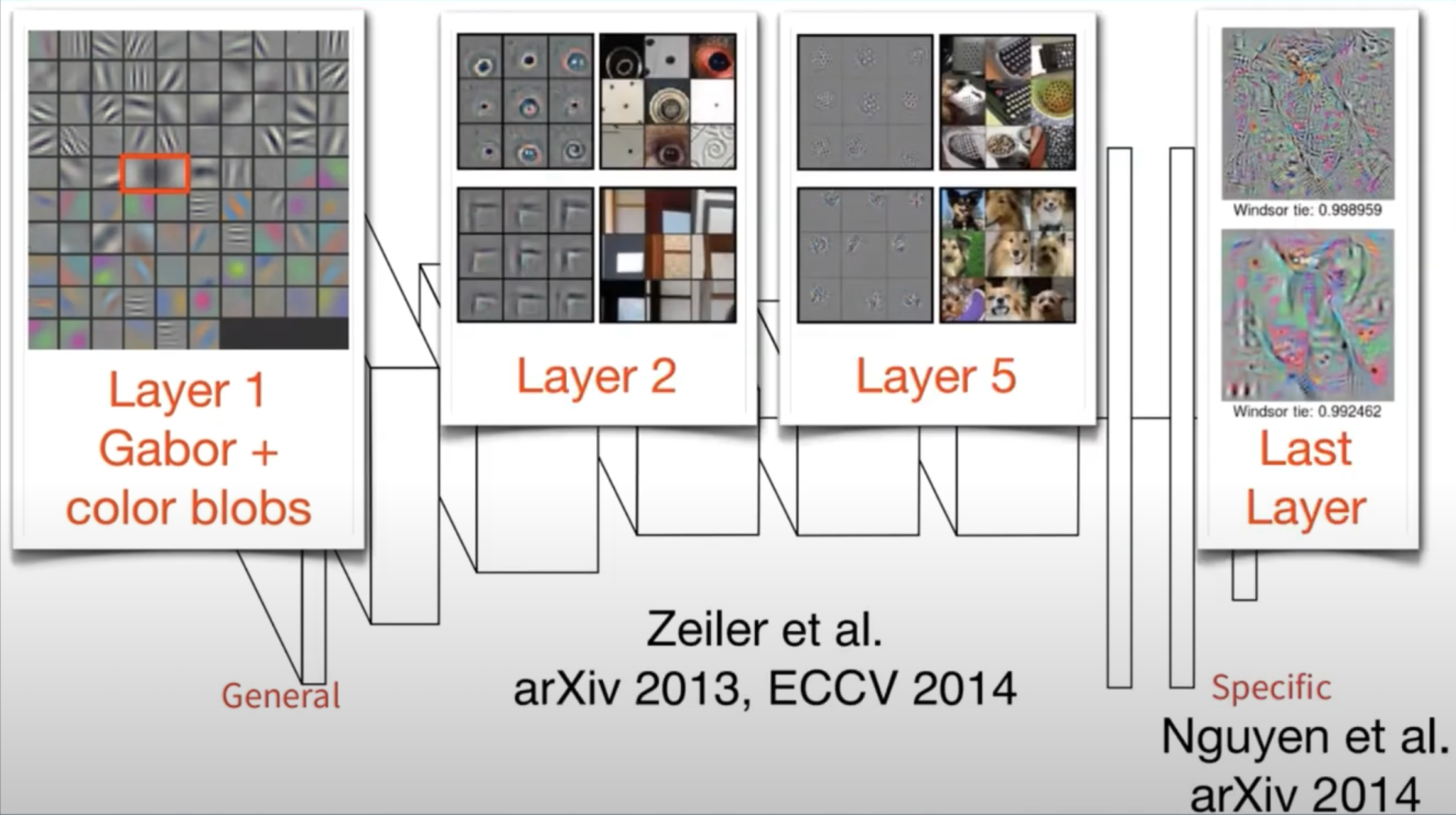 예를 들어서 보면 위 그림과 같습니다. 저층의 layer는 앞에서 본 것처럼, gabor filter와 color blobs가 나타나는데 중반 layer와 후반 layer로 갈수록 task의 specific 한 feature들이 시각화된다는 것을 볼 수 있습니다.