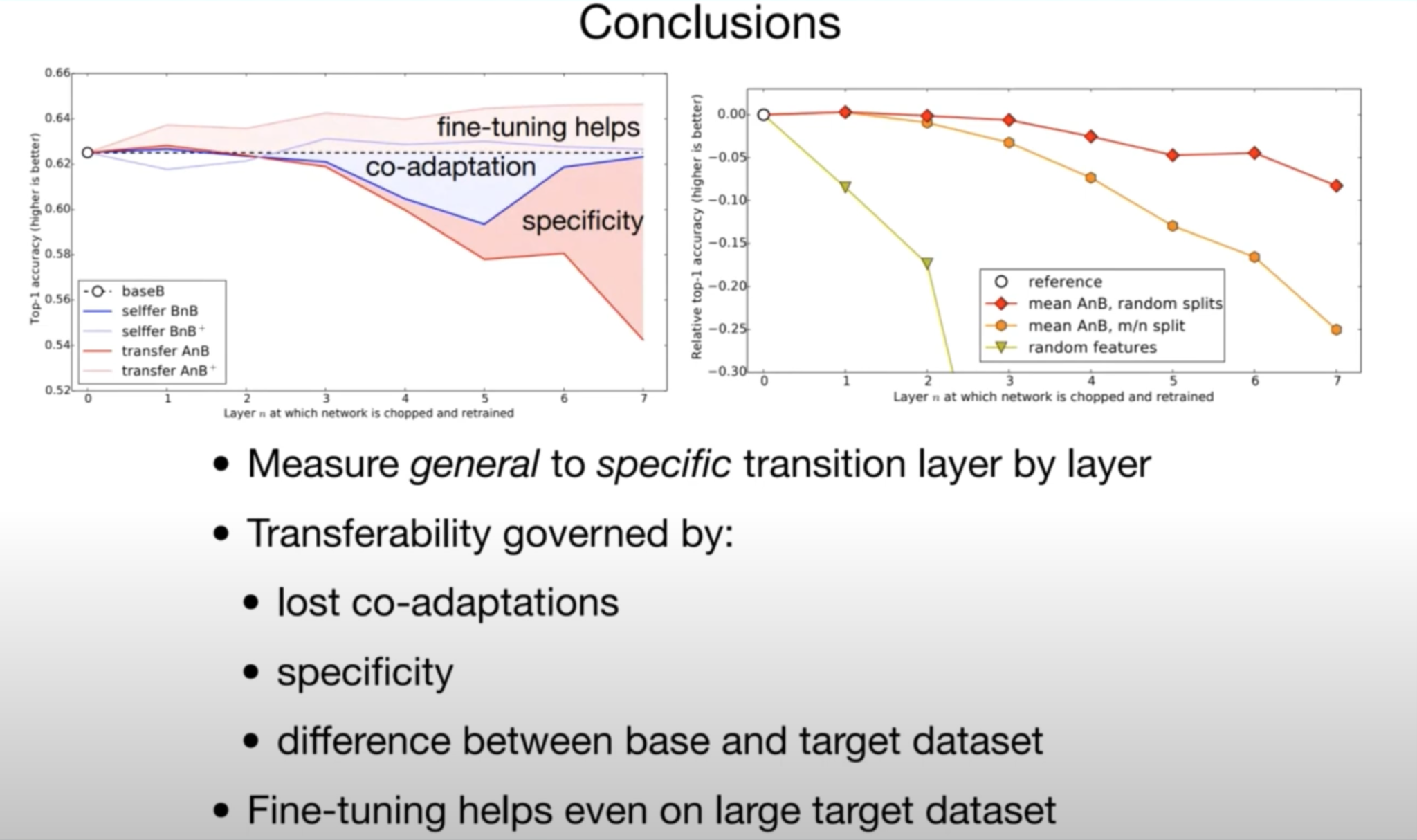 최종 결과를 정리해보겠습니다. 실험에서 layer가 얼마나 general 한 지 specific 한 지를 정량화할 수 있는 수단에 대해서 알아봤습니다. 그리고 transfer learning이 영향을 받는 요소인 co-adaptation이라는 개념을 알 수 있었습니다. 그리고 feature의 specificity를 알 수 있었고, 또 얼마나 두 task가 두 dataset이 차이가 있느냐에 따라서 transferability가 결정된다는 것을 알 수 있었습니다. 그리고 BnB+의 사례로 보듯이 fine-tuning은 언제나 도움이 된다는 것을 알 수 있었습니다.