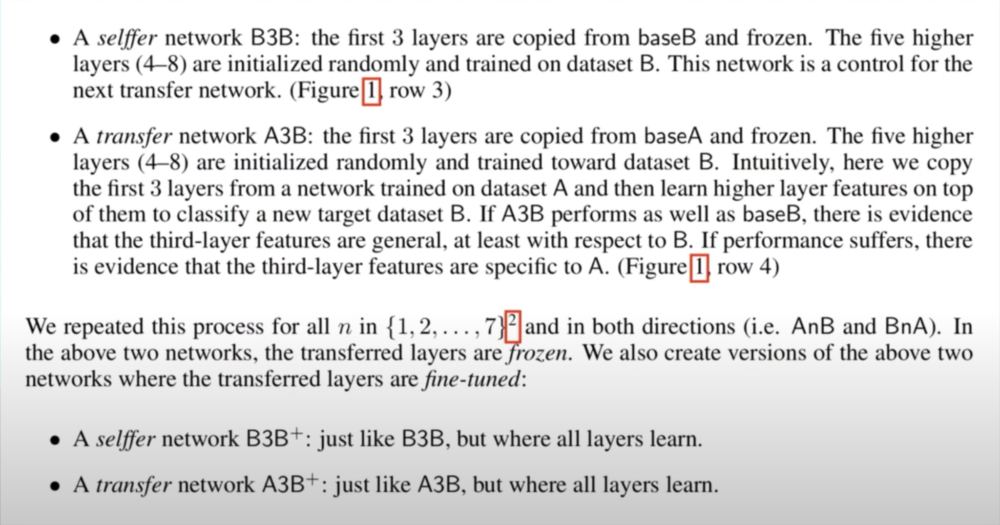 그리고 후에 있는 실험들을 설명하기에 앞서 용어들을 정의해 보겠습니다. 첫 번째로는 B3B는 B로만 전체 네트워크를 학습한 base 네트워크 B에서 첫 번째 세 개의 layer를 그대로 가져오고, 나머지 5개의 layer를 dataset B로 학습을 하되 처음에 가져왔던 layer의 가중치를 업데이트하지 않고, 가중치를 freeze 하는 네트워크를 B3B라고 합니다. 그리고 selffer network라고 부릅니다. 그리고 이 네트워크의 가운데 숫자 3은 n으로 일반화해서 가지고 오는 layer의 개수가 몇 개냐로 BnB를 정의할 수 있습니다. 다음으로는 transfer network AnB입니다. AnB는 예를 들어 설명 하겠습니다. AnB중 예를 들어 A3B는 A dataset으로만 학습한 전체 network base A에 대해서 첫 번째 3개의 layer를 가지고 와서, 그 layer의 feature를 freeze 하고 뒤 5개의 layer를 target dataset B로 학습한 것을 A3B라 합니다. 용어를 짚고 넘어가면, 가져온 가중치를 업데이트 하지 않는 것을 layer가 frozen 되었다고 하고, 가져온 layer의 가중치도 업데이트하는 것을 fine-tune 한다고 합니다. 위에서 정의한 것들은 모두 layer를 freeze 하는 것이었습니다. 이외에 B3B+, A3B+등, ‘+’ 기호는 가져온 layer도 fine-tune 하는 것을 의미합니다.