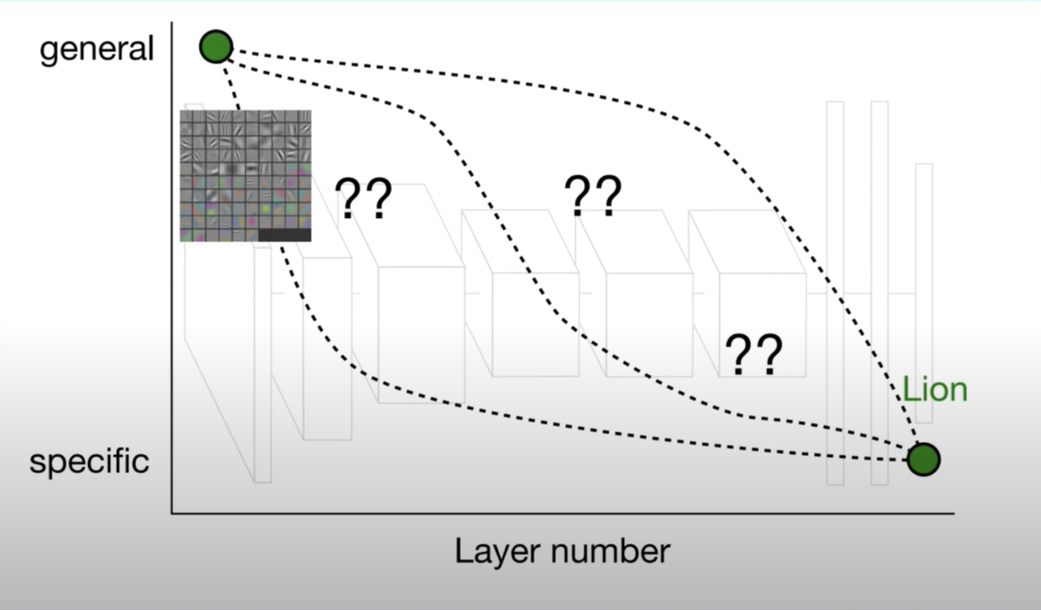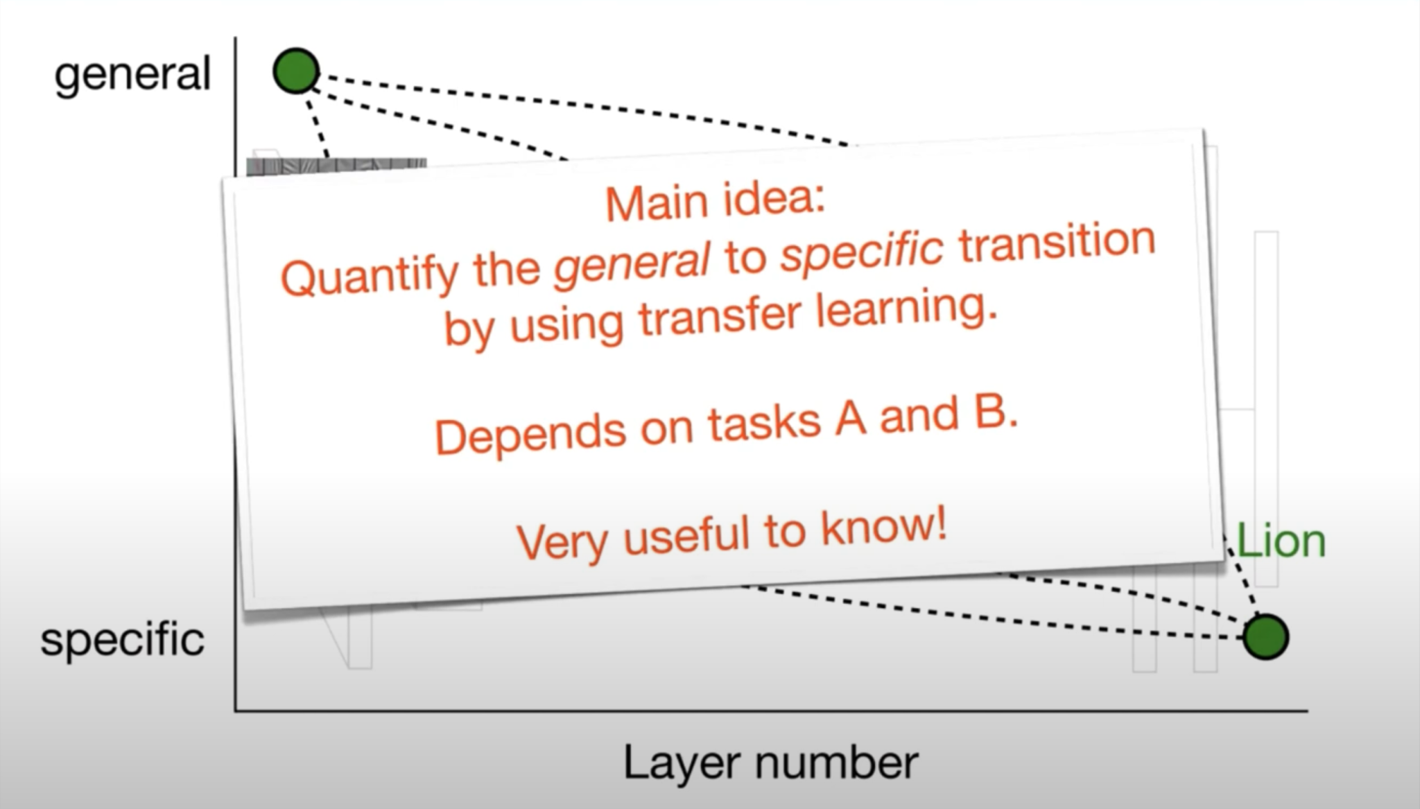 여기서 어떤 feature가 general 하다는 것을 설명하기 위해 위 그림을 살펴보겠습니다. 일반적으로 컴퓨터 비전에서 딥러닝 신경망을 학습할 때, 저층 layer에서 feature를 시각화하는 경우를 예로 들어보겠습니다. 위 그림에서 보이는 것처럼 edge를 detecting 하는 것 같은 feature 그리고 색깔 덩어리들을 detecting 하는 것 같은 feature, 즉 gabor filter와 color blobs, 가 나타나지 않으면 학습이 잘 되지 않았다고 의심할 정도로 저층 layer에서 이러한 feature들을 잘 볼 수 있습니다. 이러한 피처들을 general 하다고 하고, 서로 다른 dataset와 서로 다른 task 들에 대해서 공통적으로 나타나는 feature들이기 때문에, 이러한 feature들을 general 하다고 합니다. 그리고 layer에서 후반부로 갈수록 각 layer는 점점 더 각 네트워크에 맞는 tssk에 대해서 specific 하게 됩니다.