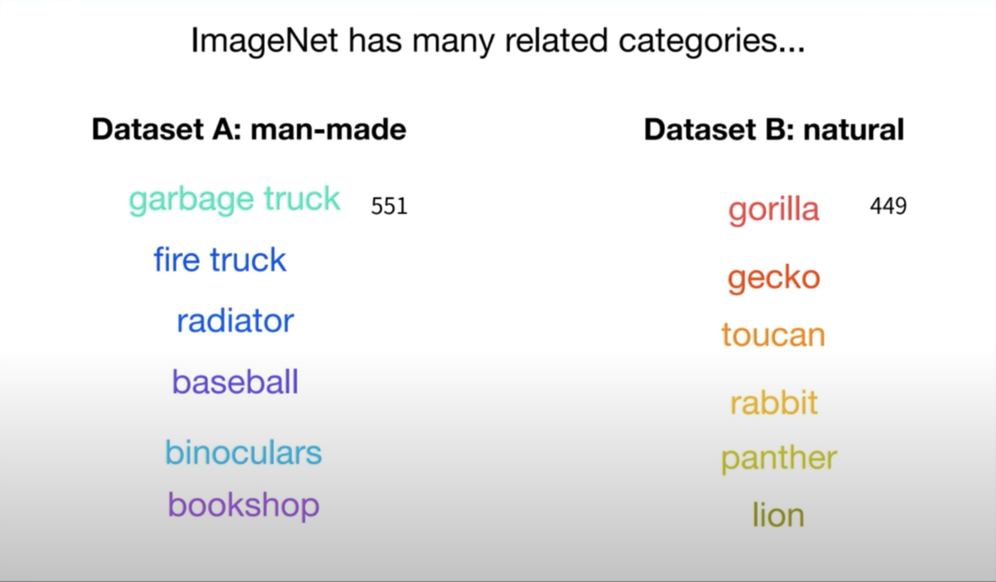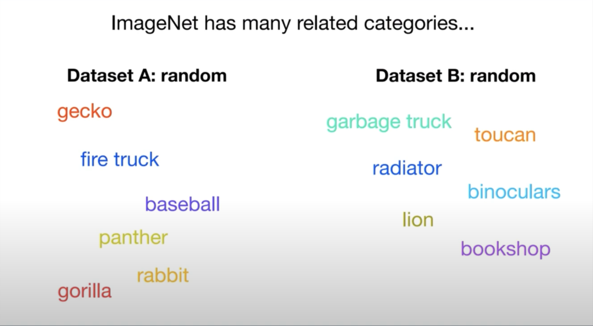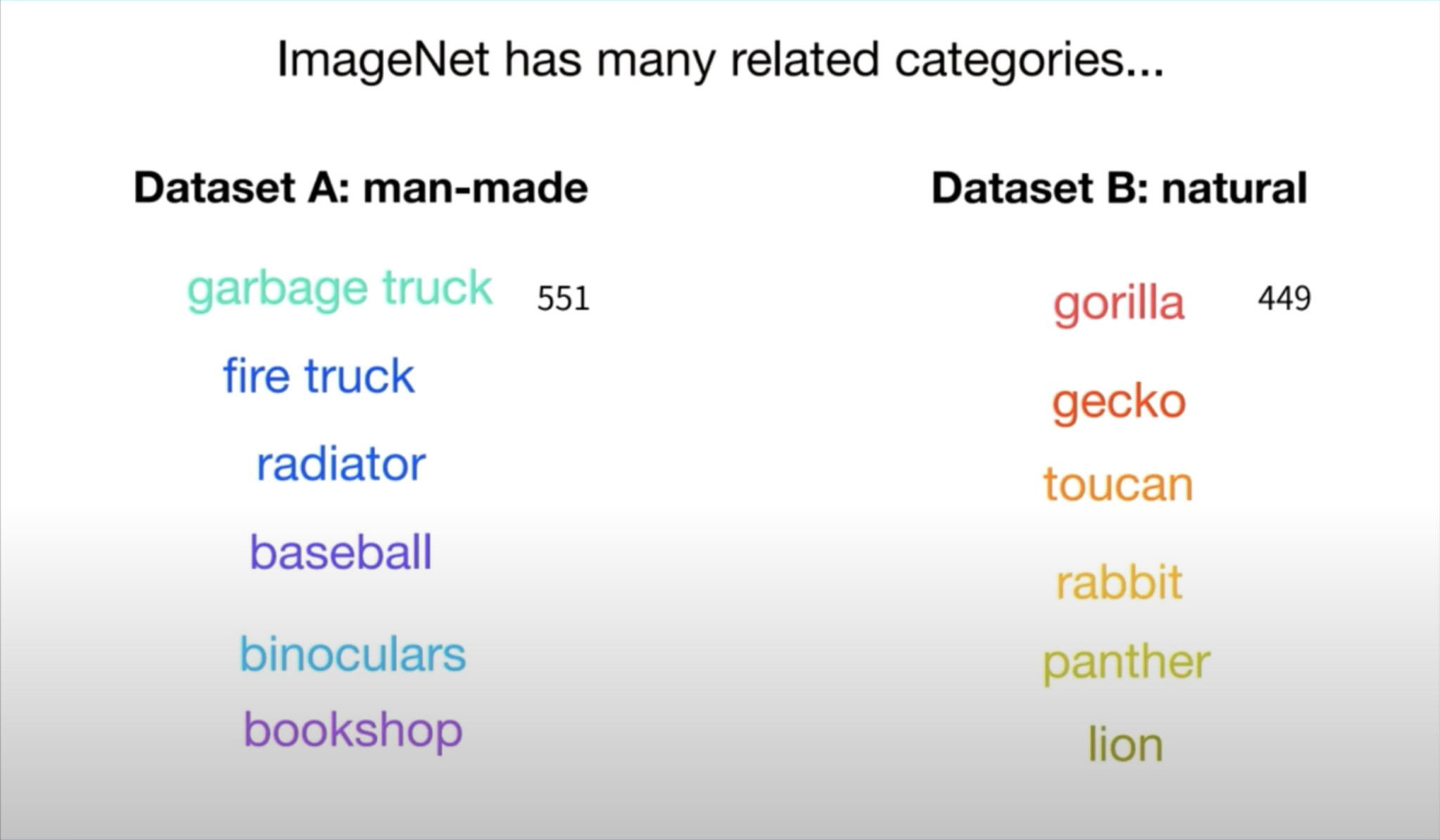 그렇게 되면 ImageNet dataset에서 연관된 카테고리들, 즉 연관된 클래스들이 많이 있습니다. 위에 보시는 바와 같이, fire truck과 garbage truck이 다른 카테고리로 1천 개 중에 속해있습니다. 이렇게 연관된 카테고리들이 랜덤하게 나눠지게 되면, dataset A와 dataset B에는, 확률적으로, 거의 절반씩의 카테고리들이 들어가게 됩니다. 따라서, 이 두 dataset은 similar 하다고 볼 수 있습니다.