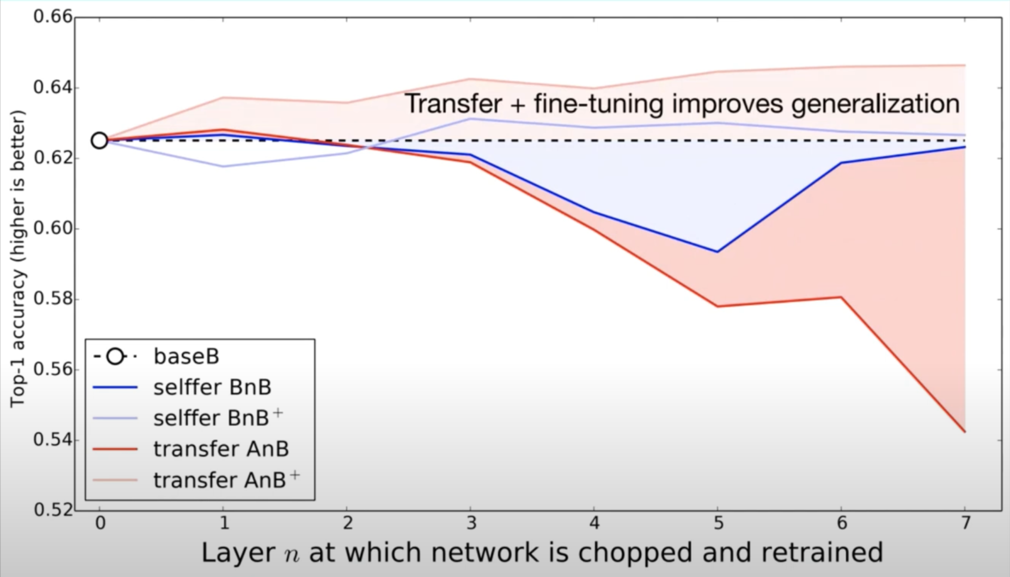 그리고, fine-tuning까지 더한 AnB와 BnB를 살펴보겠습니다. AnB+가 가장 높고, n이 커질수록 퍼포먼스가 증가합니다. 그 이유는 transfer learning도 했고, 거기에 fine-tuning까지 해서 generalization에 도움이 되었기 때문에 가장 좋은 퍼포먼스를 내고 있다고 볼 수 있습니다. 그리고 신기한 것은 BnB+도 대체적으로 n이 커질수록 모두 base B보다 높은 퍼포먼스를 내고 있습니다. 이를 통해, BnB+도 똑같은 dataset B로만 학습을 한 것이지만, 초기화가 잘 된 layer들을 가지고 와서 학습을 하느냐에 따라서 성능이 개선될 수 있다는 점을 알 수 있습니다.