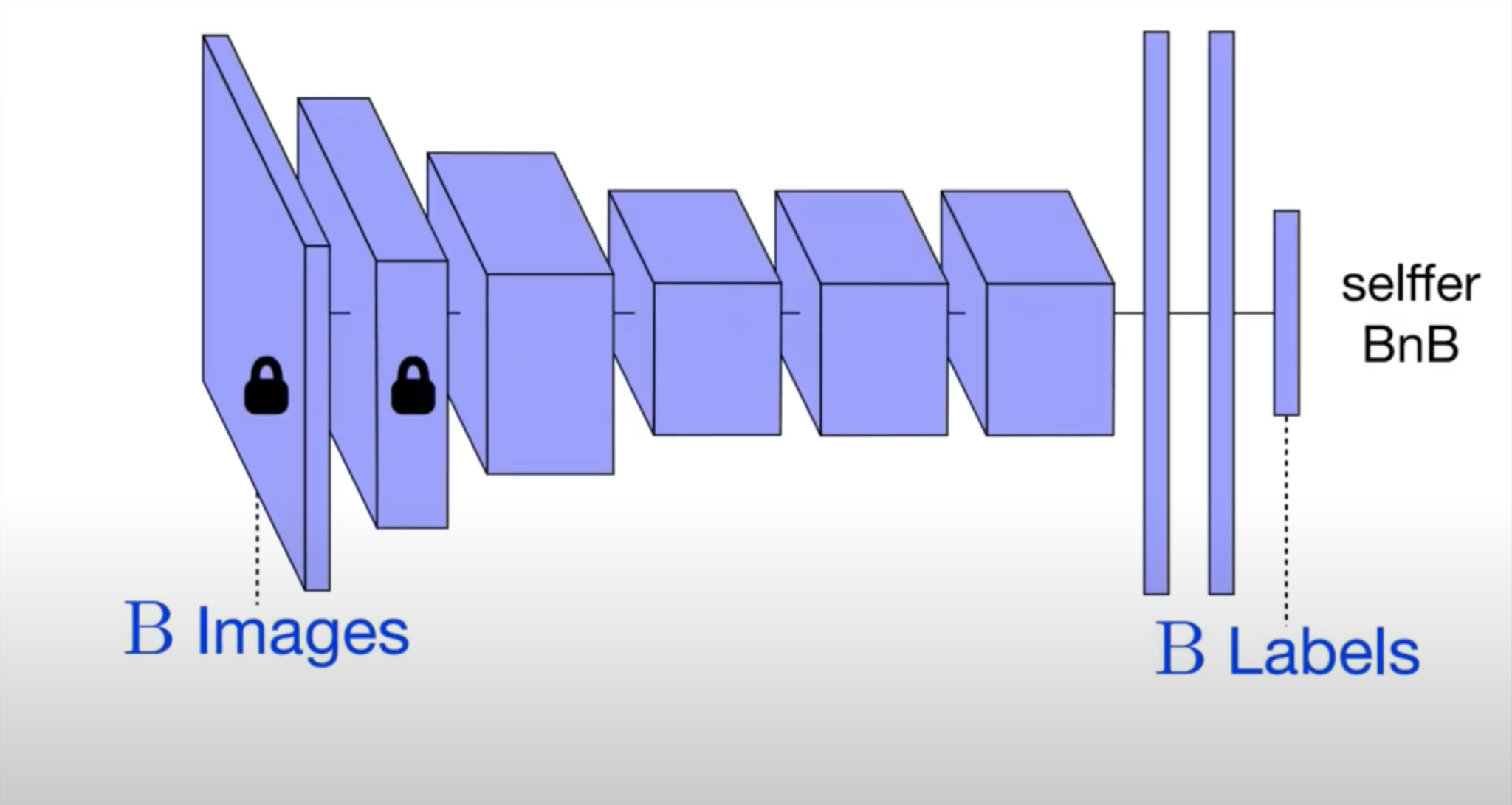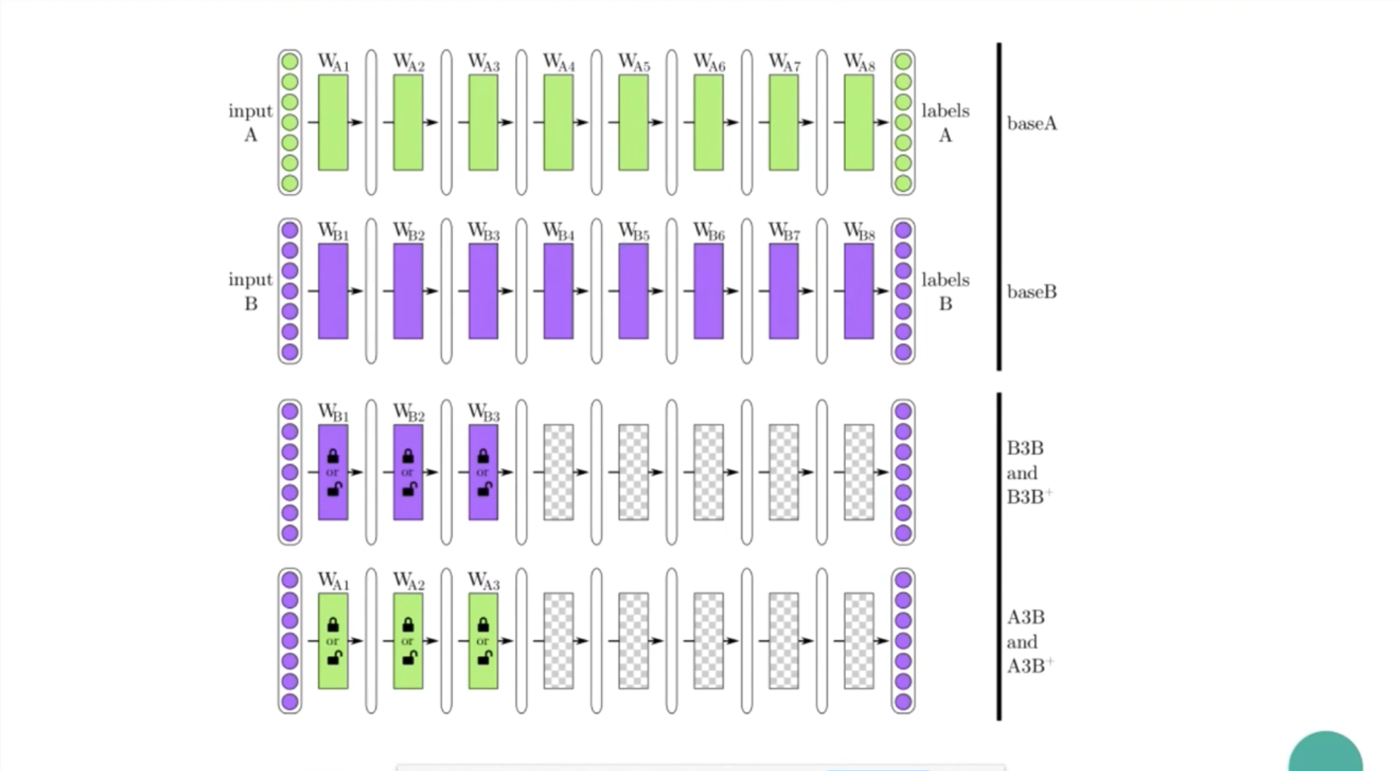 이번에는 base B로 시작하는 selffer 네트워크를 살펴보겠습니다. 먼저 base B가 있고, base B에서 저층 layer들을 그대로 가져와서 freeze 한 후에, 뒤 layer들을 똑같이 dataset B로 학습을 합니다. 그러면 selffer BnB가 될 것입니다.
