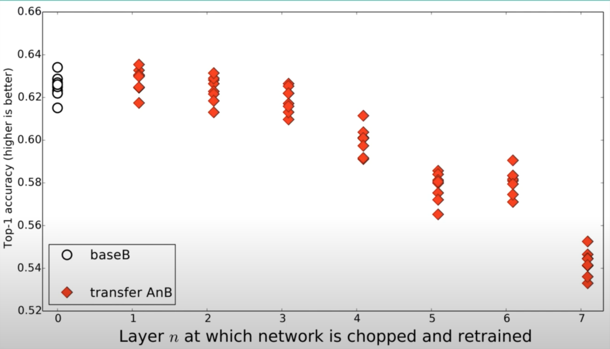 A network에서 앞에 layer를 그대로 가지고 옵니다. 그런 다음에 이 layer를 freeze 하고, 전체 network를 image B에 대해서 학습을 시킵니다. 그러면 transfer AnB가 됩니다. 위 그림에서, 색깔로 각 layer가 어떤 데이터로 학습되는지 알 수 있습니다. 이 transfer AnB의 accuracy가 n이 커짐에 따라서, base B와 비교했을 때 어떻게 바뀌는지 살펴보겠습니다.