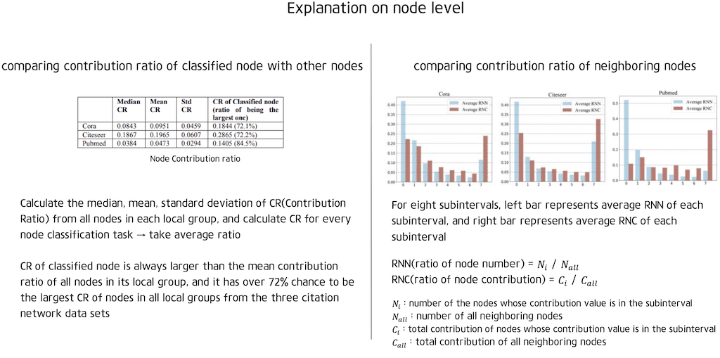 본 논문에서는 node 레벨 분석에서 node의 모든 feature relevance 스코어의 norm을 node contribution value라고 정의하였습니다. 그리고 node contribution value를 로컬 그룹의 node에서 모든 contribution value의 합으로 나누어서 node contribution ratio로 변환합니다. node 레벨 분석에서는 classify node의 contribution ratio와 neighboring node의 contribution ratio를 비교해보았는데 먼저 classify node의 contribution ratio는 각 로컬 그룹의 모든 node에서 CR의 중앙값 평균 표준편차를 계산하고 모든 node classification task에 대해 분류된 node의 CR을 계산하였습니다. 그다음 모든 분류 작업에 대해 평균 비율을 취합니다.