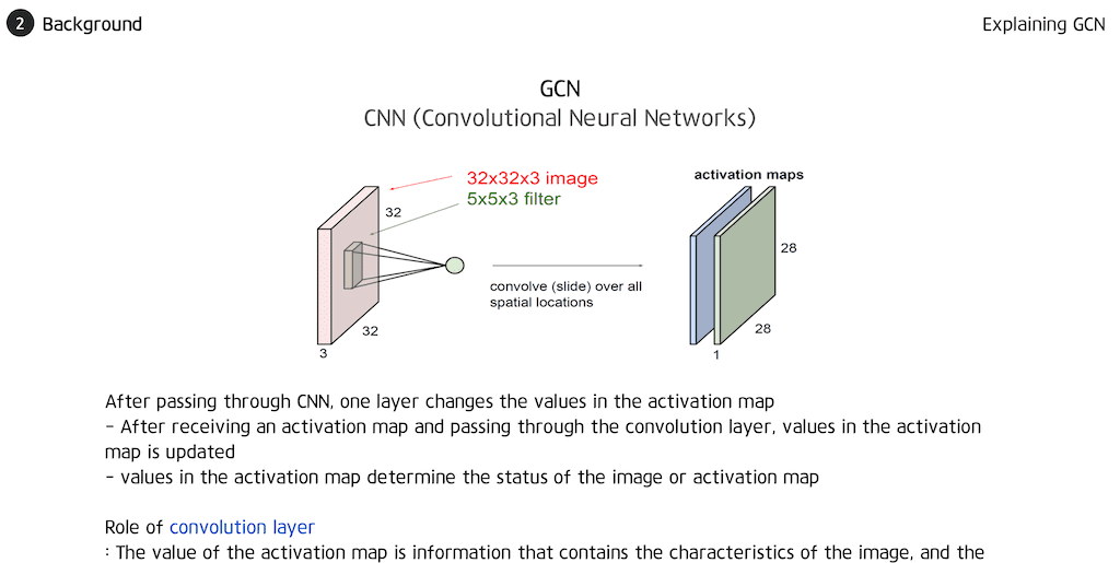 GCN의 convolutional layer는 CNN의 convolutional layer와 유사한 점들이 있어서 CNN의 convolutional layer에 대해 간단히 설명드리도록 하겠습니다 convolutional layer가 동작하는 방법은 어떤 이미지 그림에서는 32 x 32 x 32의 RGB 세 개의 채널이니까 depth가 3인 이미지가 있다고 했을 때 그보다 작은 5 x 5 depth는 동일하게 3 필터를 사용하였습니다. 그러면 필터에는 한 층에 25개의 weight가 있고 depth가 3이므로 총 75개 파라미터만 있게 됩니다. 이 필터의 값과 이미지의 75개의 각각의 값을 Dot product 해서 합쳐서 하나의 값을 뽑아내고 이런 필터를 옆으로 이동시키게 되는데 이때 STRIDE를 정해주고 STRIDE만큼 건너뛰면서 값을 쌓아서 새로운 텐서를 만들게 됩니다. 필터 하나마다 두께 1의 activation map이 나오게 되고 필터를 여러 개 씌워서 output 텐서의 depth는 필터를 몇 개 썼느냐에 따라서 정해지는 연산을 convolutional layer의 convolutional 연산이라고 합니다.