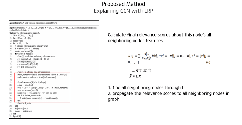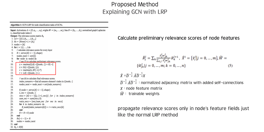 하지만 Graph 데이터에 경우 Graph 구조가 설명방법에 출력 값에도 영향을 미치기 때문에 GCN을 직접 설명하기 위해 기존 LRP 방법을 그대로 사용할 수 없습니다.