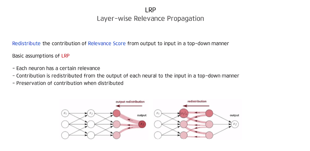 원래 입력값에서 생성된 예측값을 파악하기 위해 LRP가 도입되었으며 이는 입력 데이터가 학습된 모델에서 예측을 서포트하는 방법에 대한 설명 가능성을 제공합니다. 다른 설명방법들과 비교해서 LRP는 neural 네트워크에서 예측을 backward으로 전파하는 것에 대한 더 자세한 설명을 제공하며 LRP의 출력은 입력과 거의 동일한 예측값을 생성하기 위해 신경망에 전달될 수 있습니다.