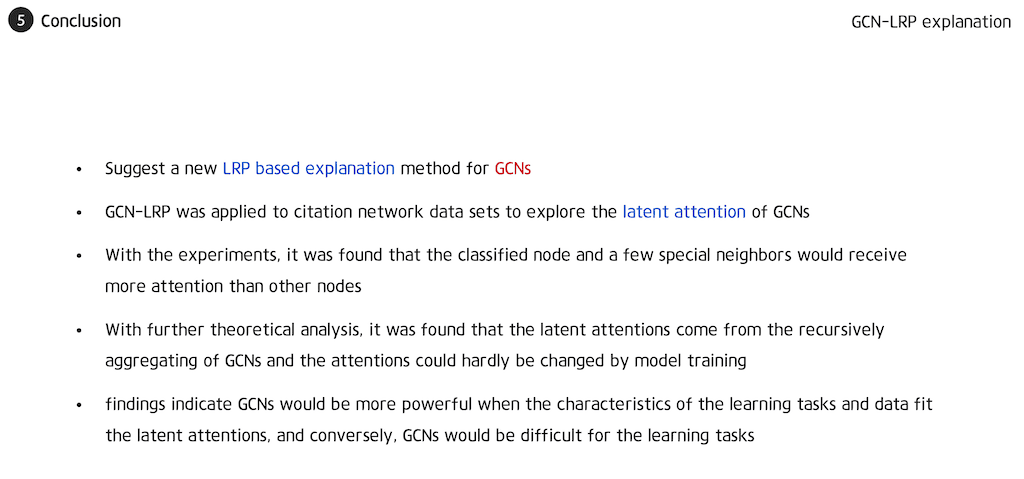 본 논문에서는 GCN에 대한 새로운 LRP 기반 설명 방법 GCN-LRP를 제안하였습니다. 또한 GCN의 latent attention을 탐구하기 위해 인용 네트워크 데이터셋 및 합성 Graph 데이터셋에 GCN-LRP를 적용하였습니다. 실험을 통해 분류된 node와 몇몇 특별한 neighbor가 다른 node보다 더 많은 attention을 받는다는 것을 발견했습니다.