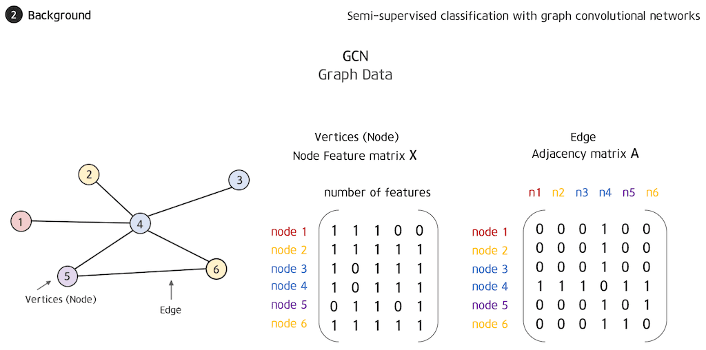 GCN을 설명드리기 전에 Graph 데이터의 특징에 대해서도 간략히 설명드리자면 Vertices의 셋과 Edge의 셋으로 이루어져 있는 것을 Graph라고 부릅니다. 1 2 3 4 5 6과 같은 Vertices들이 있고 1과 4 사이에는 Edge가 있고 어떤 두 Vertices 사이에 없는 형태를 Graph라고 정의하게 됩니다.