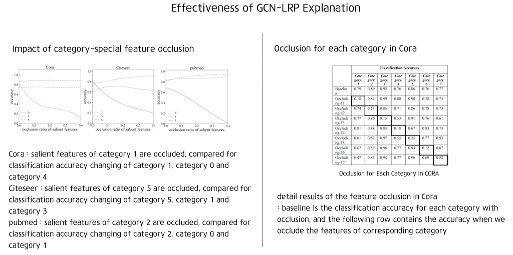 GCN-LRP 설명 기법의 효율성은 설명 방법에 의해 포착된 두드러진 특징을 occluded 함으로써 검증을 진행하였습니다. 다시 말해서 각 카테고리에 대한 node를 분류할 때 분류 정확도의 변화를 알기 위해서 feature들을 occluded 하였습니다. occlusion은 제로 마스크를 사용하여 구현됩니다. 즉 나머지 기능을 일정하게 유지하면서 선택한 feature를 0으로 설정합니다.