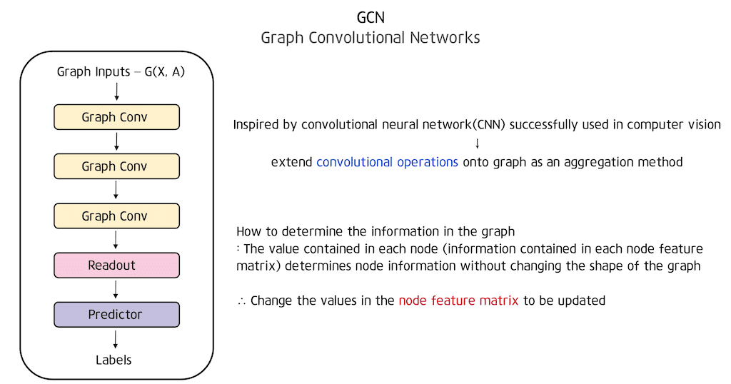 GCN에 대한 전체적인 구조는 좌측 그림과 같으며 Graph 형태의 어떤 인풋이 오고 Adjacency matrix A와 node feature matrix X로 나타내어지는 인풋을 받게 됩니다. 그 인풋의 Graph convolutional layer를 여러 번 수행해주면 더 고차원적인 정보를 담을 수 있게 됩니다.