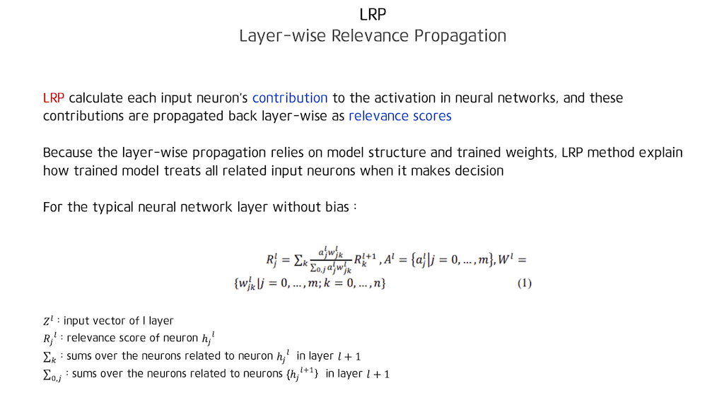 수식과 더불어 조금 더 자세히 설명드리자면 LRP는 neural 네트워크에 activation에 대한 각 인풋 neuron의 contribution을 계산하고, 이런 contribution은 Relevance 스코어로 계층별로 다시 전파합니다.