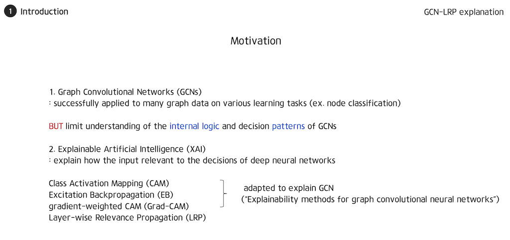 저자가 왜 GCN-LRP 모델을 만들게 되었는지 그 Motivation에 대해 간단히 소개를 하고 관련 연구로 GCN-LRP에 대해 간략히 설명드리겠습니다. 그다음 기존 LRP를 단순히 GCN에 적용하였을 때 생기는 문제점들을 해결하기 위해 본 논문에서 제안하는 방법에 대해 설명을 한 뒤 성능 평가를 하고 결론을 맺겠습니다.