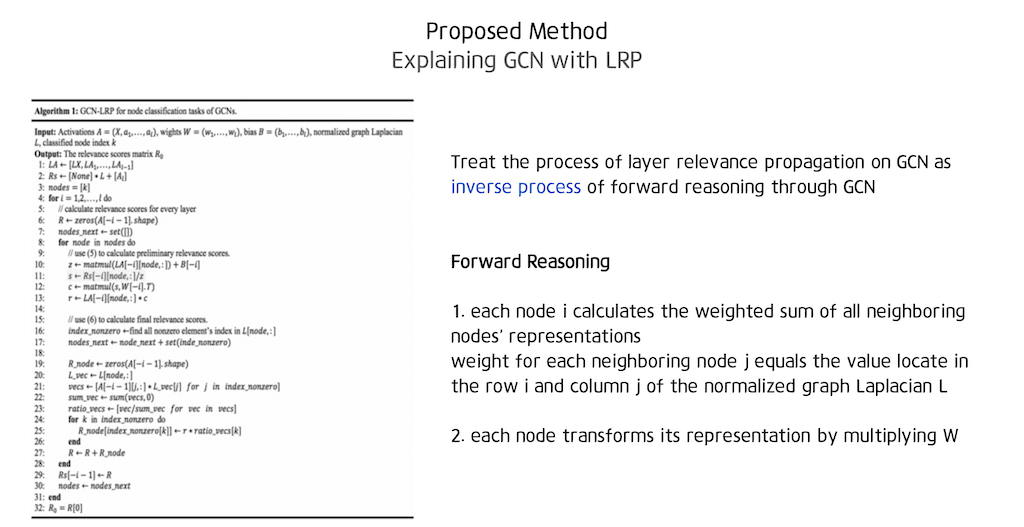 하지만 Graph 데이터에 경우 Graph 구조가 설명방법에 출력 값에도 영향을 미치기 때문에 GCN을 직접 설명하기 위해 기존 LRP 방법을 그대로 사용할 수 없습니다.