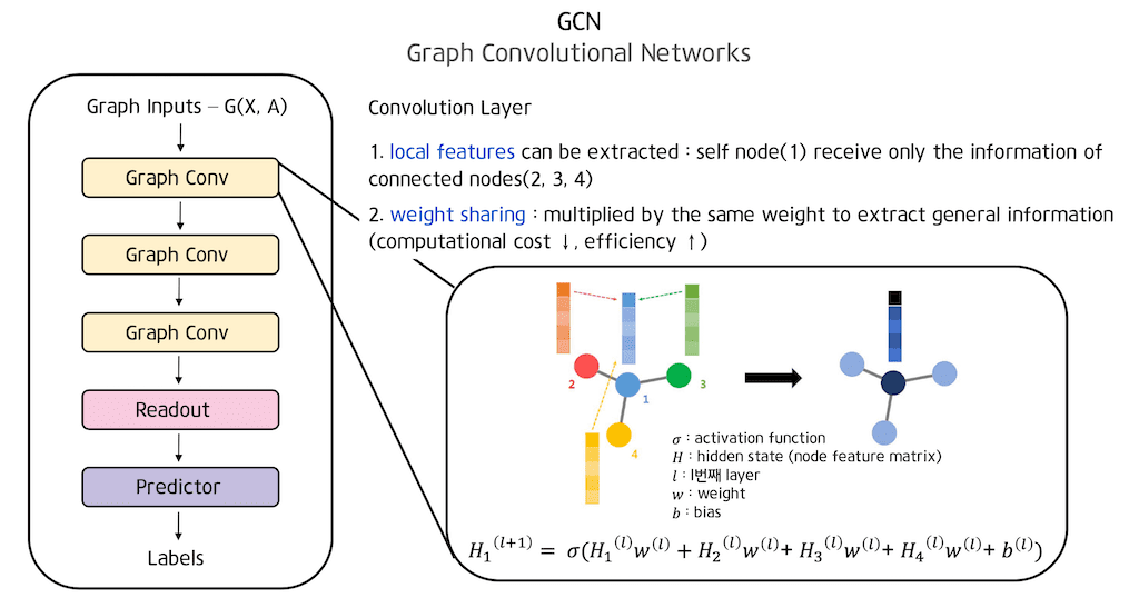 GCN이 Graph convolutional network니까 이 모델도 convolution 연산을 수행한다는 것을 알 수 있습니다. convolutional layer의 역할이라고 한다면 그 layer를 거칠 때마다 activation map에 value값을 업데이트시켜준다고 볼 수 있습니다.