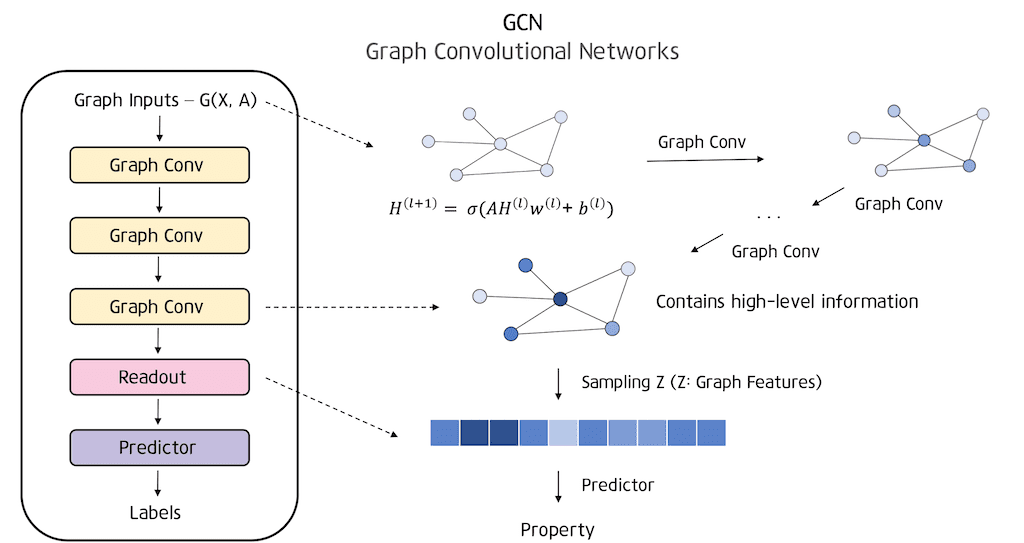 GCN에 대한 전체적인 구조는 좌측 그림과 같으며 Graph 형태의 어떤 인풋이 오고 Adjacency matrix A와 node feature matrix X로 나타내어지는 인풋을 받게 됩니다. 그 인풋의 Graph convolutional layer를 여러 번 수행해주면 더 고차원적인 정보를 담을 수 있게 됩니다.