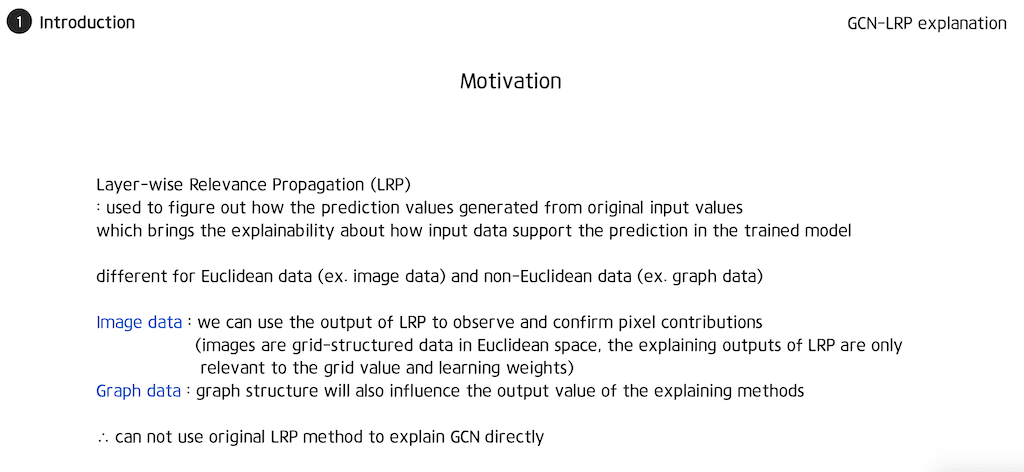 저자가 왜 GCN-LRP 모델을 만들게 되었는지 그 Motivation에 대해 간단히 소개를 하고 관련 연구로 GCN-LRP에 대해 간략히 설명드리겠습니다. 그다음 기존 LRP를 단순히 GCN에 적용하였을 때 생기는 문제점들을 해결하기 위해 본 논문에서 제안하는 방법에 대해 설명을 한 뒤 성능 평가를 하고 결론을 맺겠습니다.