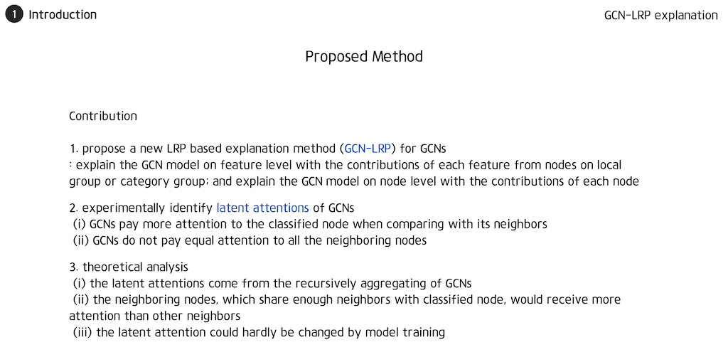 따라서 본 논문에서는 GCN에 대한 새로운 LRP 설명방법을 제안합니다. 또한 이론적으로 latent attention이 어디에서 오고 왜 이런 attention이 데이터의 label 정보 및 모델 훈련으로 거의 바뀔 수 없는지를 분석합니다.