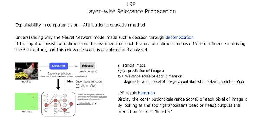 화면에 그림처럼 수탉 사진을 훈련된 분류기에 넣어주면 그 분류기가 수탉이라는 결과를 내주게 되게 되는데 히트맵에서 각 픽셀들의 relevance 스코어를 색깔로 표시해 두며 해당 예시에는 수탉의 부리나 머리 부분을 보고 해당 입력에 클래스가 수탉임을 출력했다는 것을 알 수 있습니다.