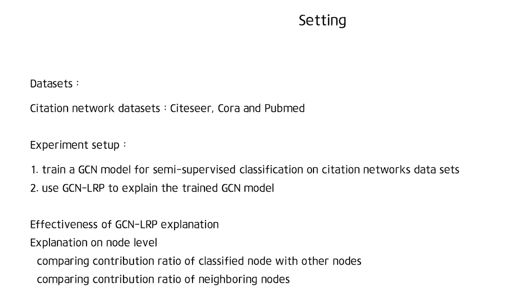 실험에서는 Citation 네트워크 데이터에 대해서 semi - supervised classification GCN 모델을 이용해서 학습을 시킨 다음에 GCN LRP를 이용해서 학습된 GCN 모델을 설명하였습니다.