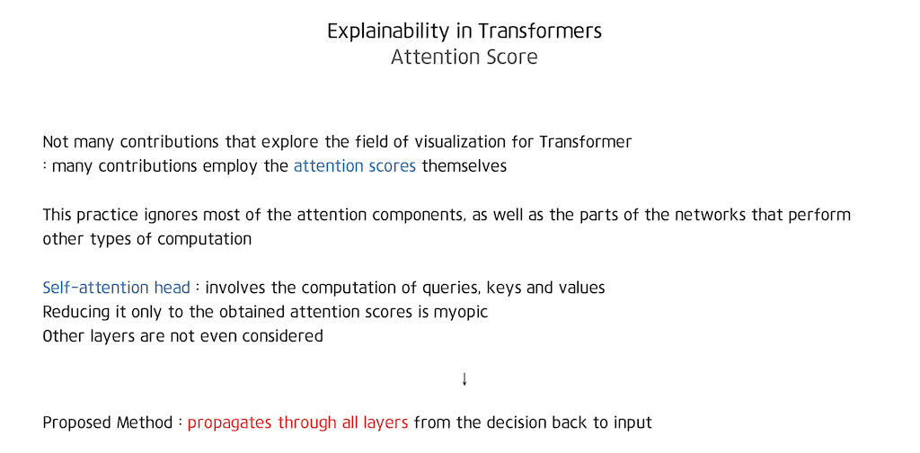 Transformer를 위한 시각화 방법 분야에서는 아직 그렇게 많은 기여가 없으며 기껏 해봐야 attention 스코어를 활용한 정도입니다. 현재 이런 접근법들은 다른 종류의 연산을 수행하는 네트워크 일부분뿐만 아니라 attention 구성 요소 대부분을 간과합니다. 가령 Self attention head는 Query, key, value 등의 연산을 수행하는데 이를 내적 하여 얻어진 attention 스코어에만 초점을 두는 것은 근시안적인 접근이라고 할 수 있습니다.