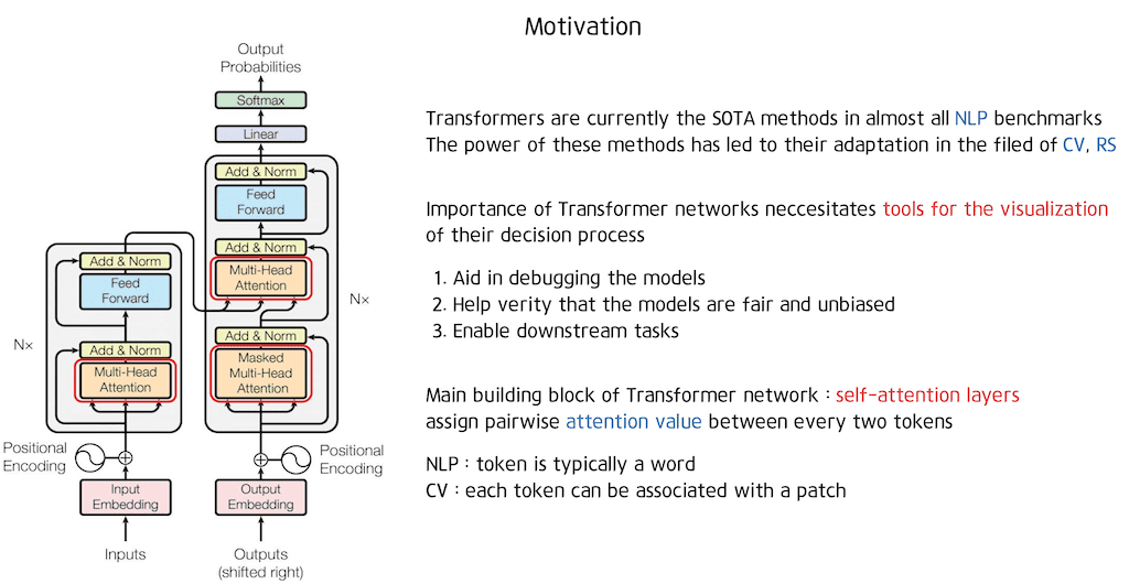 positive 한 활성화 함수 skip connection의 빈번한 쓰임 그리고 self attention에 쓰이는 매트릭스 multiplication 모델링의 어려움 때문에 현재 Transformer의 해석 가능성에 대한 문화는 매우 적습니다. 이에 본 논문에서는 Transformer 모델에 의사 결정 과정을 해석하고 시각화하는 방법을 제안하였습니다. 그리고 이 방법은 기존 논문들의 각각의 문제점에 대한 해결책을 제공해 주었습니다.