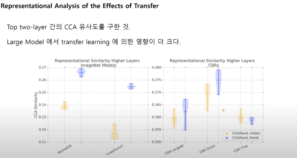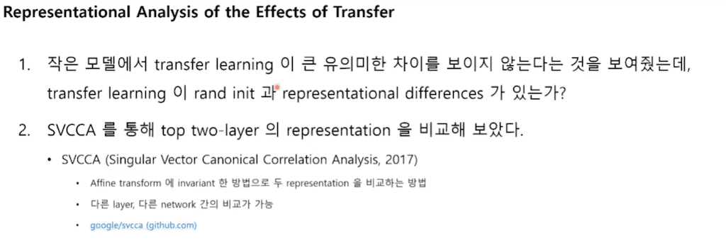 지금까지 작은 모델에서 Transfer learning이 유의미한 차이를 보이지 않는다는 것을 보여 줬습니다. 여기서 Transfer learning과 Random Initialize로 학습한 모델에 Representation이 다르다는 것을 보여줍니다. 유사도 측정 매트릭으로는 SVCCA를 사용했습니다. 어떤 두 벡터의 유사도를 Affine transform에 invariant 한 방법으로 측정하는 방법입니다. 이 방법을 사용하면 다른 layer, 심지어 다른 네트워크 간의 feature도 비교를 할 수 있게 됩니다.