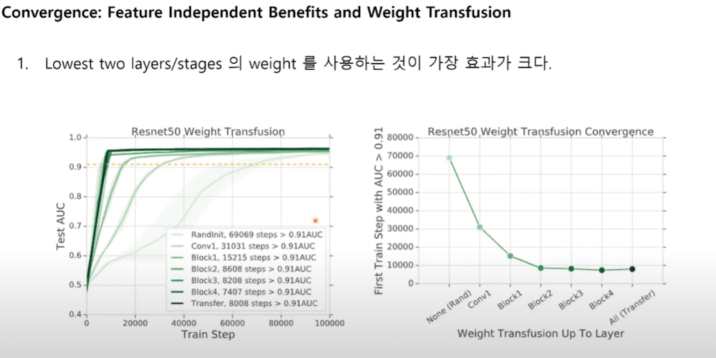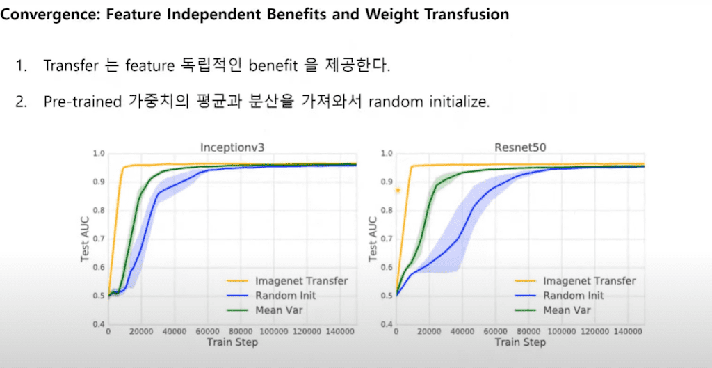 Transfer learning의 장점은 단순히 좋은 feature를 Transfer 했기 때문이기도 하겠지만 statistical 한 영향도 있다고 설명합니다.그래서 independent 한 benefit을 제공한다고 언급을 하고 있습니다. 해당 그래프는 pre traind 가중치에 평균과 분산만을 가져와서 모델의 가중치를 Random Initialize 한 것입니다. 그래프를 보시면 초록색인데 훨씬 더 빠르게 수렴하는 것을 볼 수 있습니다.