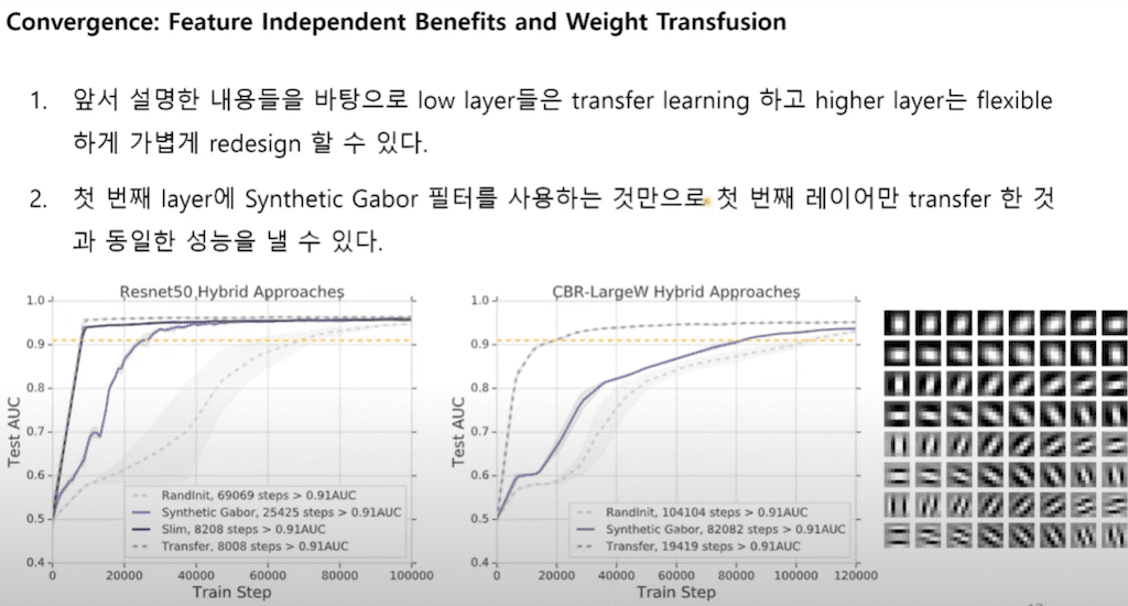 왼쪽 표를 보시면 처음으로 AUC 0.91를 추가한 것이 200 step 밖에 차이 나지 않습니다. 여기 보시면 Transfer learning은 8.8 step을 넘었고 Slim 모델은 8208의 0.91을 넘었습니다. 두 번째로는 Synthetic Gabor 필터를 첫 번째 layer 가중치 초기화하여 사용하는 것입니다. 이는 표에 나와 있지는 않지만 첫 번째 layer만 Transfer learning 한 것과 동일한 성능을 보여 준다고 합니다.