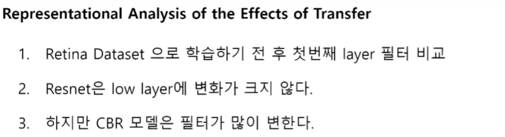 Retina 데이터셋 학습 전후에 첫 번째 layer에 필터를 시각화한 것입니다. 위에서 언급한 대로 ResNet은 필터에 큰 변화가 없습니다. 이는 over parameterization을 암시합니다. 굳이 모든 필터를 다 학습하지 않아도 충분한 성능을 낼 수 있습니다. 하지만 CBR 모델은 필터가 많이 변한 것을 볼 수 있습니다. 왼쪽 아래 보시면 학습 초기와 학습이 끝난 후에 필터 모습이 많이 다른 것을 확인할 수 있습니다.