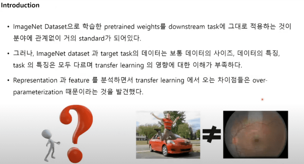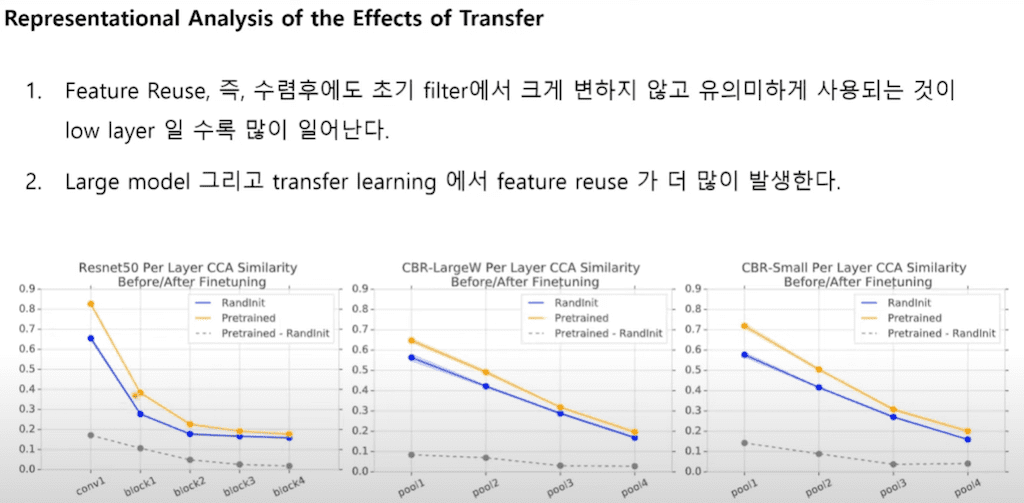 Representation과 feature를 분석해보니 Transfer learning에서 오는 차이점들은 over-parameterization 때문이라고 합니다. 이 말을 풀어서 설명하면 task에 비해 모델의 사이즈가 너무 커서 over parameterization이 발생하여 모델이 제대로 된 feature를 downstream task의 데이터셋 만으로는 학습하기에 충분하지 않기 때문에 Transfer learning에 의한 차이가 발생한다는 의미입니다. 여기서 충분하지 않다는 말은 데이터양이 될 수도 있고 데이터가 가지는 특징이 될 수도 있습니다.