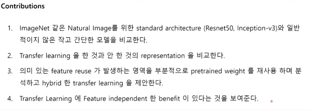 - Transfer learning에 대한 의문들을 연구했고 의료 데이터를 가지고 실험적으로 설명을 하고 있습니다.