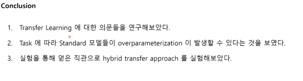- 실험을 통해 얻은 직관으로 hybrid Transfer approach를 실험했습니다. Transfer learning을 무작정 사용하는 것이 아니고 어느 정도 이해하고 어디에서 유의미한 feature reuse가 발생을 하는지 실험을 통해 확인할 수 있습니다.