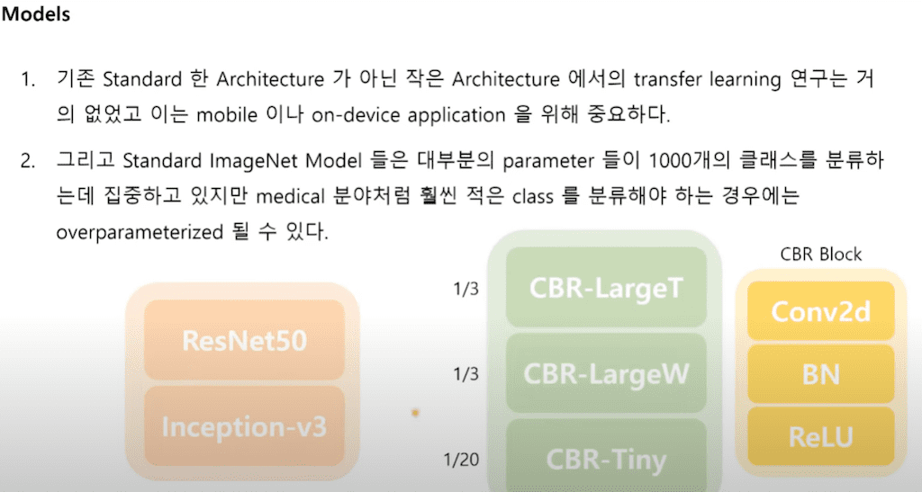 이 논문에서 Standard 모델로는 ResNet50과 Inception-v3를 사용했고 small 모델로는 직접 설계한 CBR 모델을 사용했습니다. CBR은 Conv layer , BN 그리고 ReLu로 구성된 하나의 블록이고 이것을 반복해서 CBR 모델을 생성을 합니다. ResNet50과 Inception의 파라미터에 3분의 1 정도를 가지도록 구성된 것이 CBR-LargeT와 CBR-LargeW 가 있고, ResNet에서 파라미터의 20분의 1이 되도록 설계한 것이 CBR-Tiny입니다.