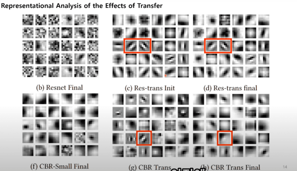 왼쪽에 Random Initialize를 한 경우에는 학습이 끝난 후에도 ResNet은 유의미한 필터를 학습하지 못한 부분들이 많이 보입니다. ResNet의 경우 Transfer learning을 해도 Gabor 필터라고 하는 필터들이 잘 사라지지 않고 잘 남아 있는 반면에 밑에 보시면 CBR small 모델에서는 이런 필터들이 뭉개지고 사라지는 경향이 있습니다. 이런 Gabor 필터라고 하는 것은 텍스처 특징을 뽑는데 좋은 필터입니다. 이전에 Transfer learning의 영향이 Large 모델에서 더 큰 이유입니다.