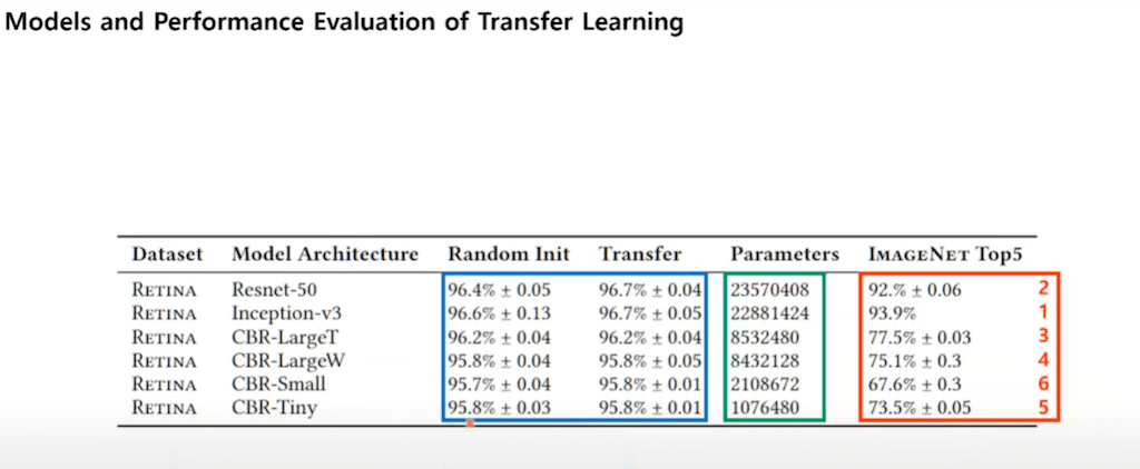 우선 파란 상자를 보면 CBR 모델들은 모두 Transfer learning과 Random Initialize 간의 차이가 거의 없습니다. Standard 모델에서는 아주 약간의 차이로 Transfer learning이 더 좋습니다.