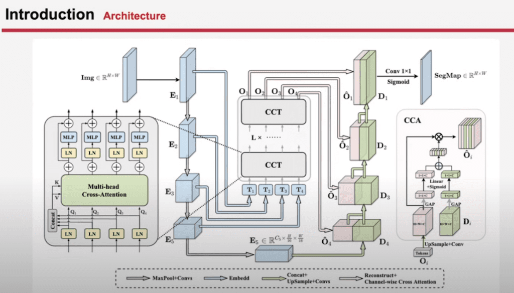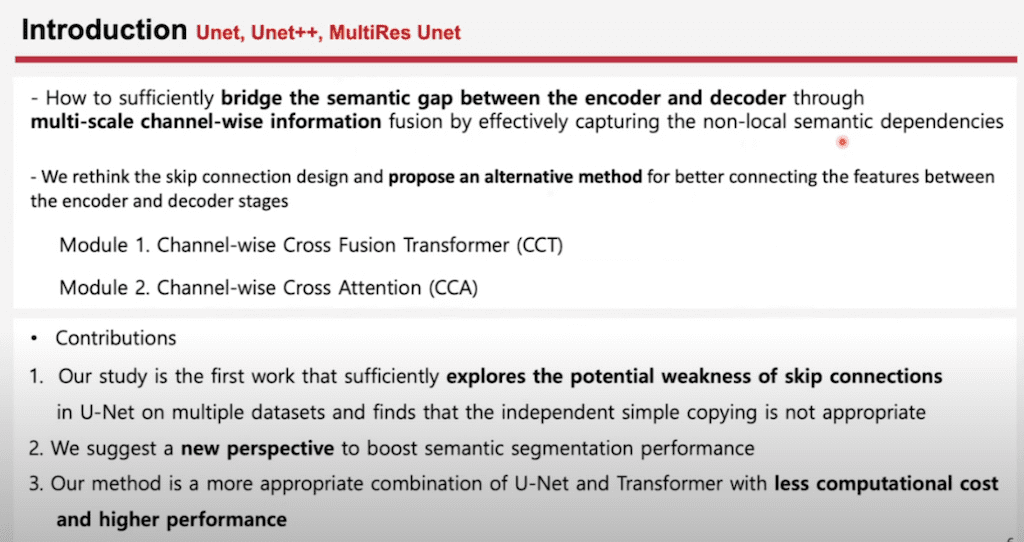 발표에 앞서 들어가기 전에 전체 논문에서 제안했던 모델에 대해서 보고 넘어가겠습니다. U-Net과 비슷한 구조에다가 Skip connection이 Transformer 베이스의 모델로 대체된 것을 확인할 수 있습니다. 그리고 추가적으로 decoder에 만나기 전에 한번 더 가공하는 모듈이 추가되어서 U-Net 구조에다가 CCT와 CCA 두 가지 모듈을 통합해서 제안한 모델을 이야기하고 있습니다.