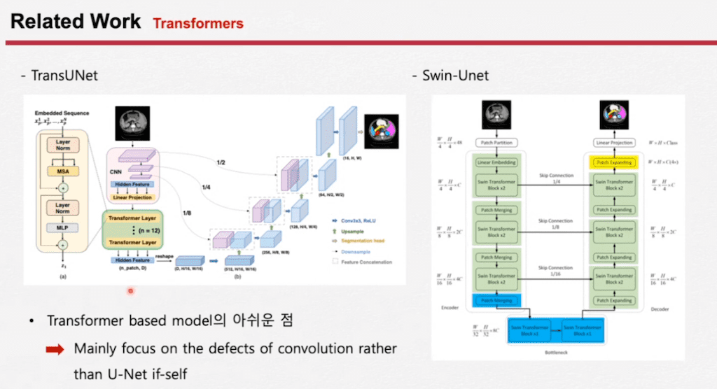 첫 번째로 TransUNet 그리고 Swin-Unet 같은 경우에는 Vision Transformer가 크게 유행하면서 제안된 모델들입니다. TransUNet 같은 경우에는 CNN과 vision Transformer를 합쳐서 UNet 구조를 개선하였고 Swin-Unet은 Swin Transformer block을 decoder까지도 만들어주면서 성능을 올려서 다양한 데이터셋의 SOTA를 달성하고 있는 모델입니다. 여기 base 모델의 아쉬운 점은 Convolution의 단점 자체에만 집중을 하다 보니까 UNet 구조에 대해서 고민을 덜 했다고 이야기를 하고 있습니다.