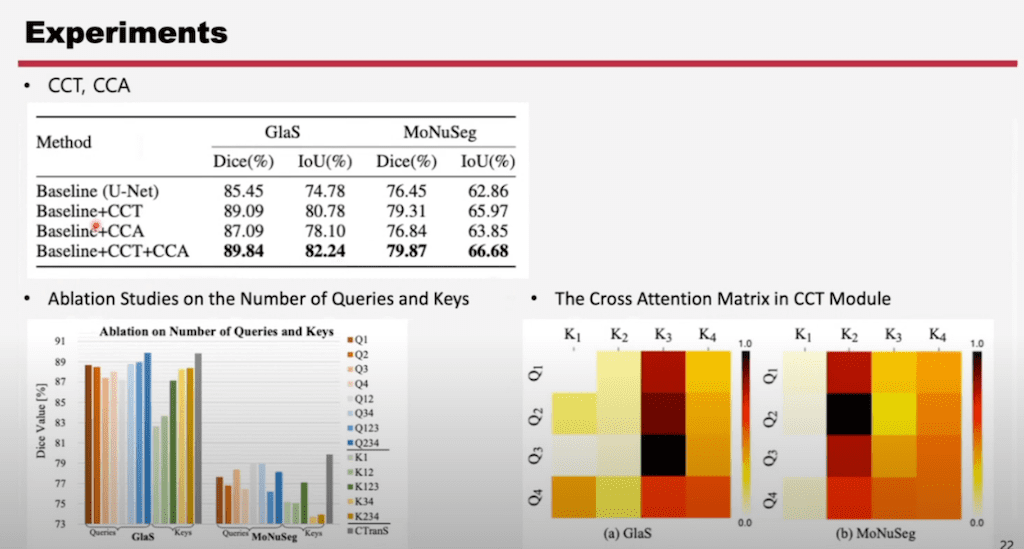 CCT와 CCA 각각의 모듈이 UNet에서 추가될 때마다 각각의 데이터셋이 어떻게 성능이 올라가는가를 보여주고 있습니다.